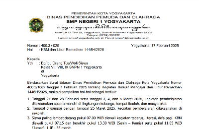 Selamat datang di website SMP Negeri 1 Yogyakarta. Sekolah berwawasan IPTEK, lingkungan hidup, berlandaskan imtaq, serta berpijak pada budaya bangsa.